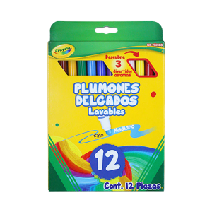 Plumón de la marca Crayola, delgado de colores brillantes, la punta permite realizar trazos finos o medianos, no se escurren en la mayoría de y se quitan fácilmente de la piel y ropa. EspecificacionesCertificacionesESR, ASTMD4236, APUsoPintar, colorear, trazarColorSurtidoMaterialPlásticoUnidad de medida/PresentaciónPaquete c/12Tipo de puntaCón..