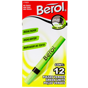 Marca textos de la marca Berol, con punta tipo cincel que no se deforma, puedes usarlo en todo tipo de superficie, resalta tus textos con confianza ya que no mancha ni se corre. No es tóxica, seca de manera rápida y se adapta con comodidad a la mano.EspecificacionesUsoResaltar, señalar, marcarColorVerdeMaterialPlásticoUnidad de medida/Present..