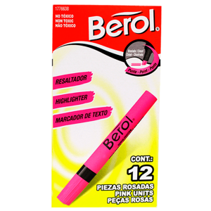 Marca textos de la marca Berol, con punta tipo cincel que no se deforma, puedes usarlo en todo tipo de superficie, resalta tus textos con confianza ya que no mancha ni se corre. No tóxico, seca de manera rápida y se adapta con comodidad a la mano.EspecificacionesUsoResaltar, señalar, marcarColorRosaMaterialPlásticoUnidad de medida/Presentació..