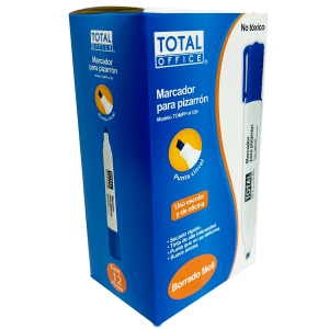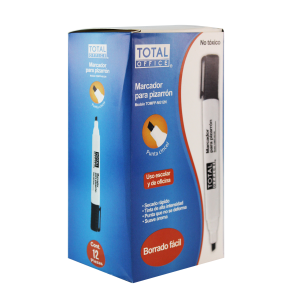 Marcador para pizarrón blanco de la marca Total Office, con punta tipo cincel que no se deforma y proporciona una escritura y trazos definidos. Su tinta base alcohol, no tóxica y de alta intensidad, seca de manera rápida dejando un suave aroma, es fácil de borrar.EspecificacionesCertificacionesISO 9001, ISO 9001-2000UsoEscribir, dibujar, señal..