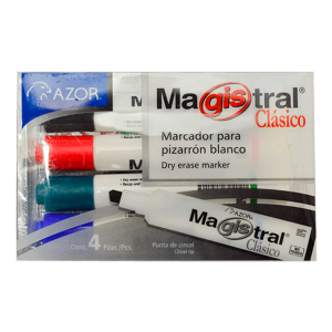 Marcador para pizarrón blanco de la marca Azor, punta cincel, tinta de alta duración y rendimiento, se borran fácilmente, no dejan huella y no maltratan los pizarrones. Ideales para la escuela.EspecificacionesUsoEscribir, dibujar, señalarColorVariosMaterialPlásticoUnidad de medida/PresentaciónEstuche c/4Tipo de tintaBase alcoholTipo de puntaCincelT..