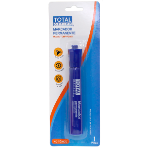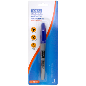 Marcador permanente de la marca Total Office, con punta tipo cincel que no se deforma y te permite escribir sobre diversas superficies, con líneas y trazos bien definidos. Su tinta base alcohol no tóxica es resistente al agua y seca de manera rápida.EspecificacionesCertificacionesISO 9001, ISO 9001-2000UsoRotular, señalar, marcarColorAzulMater..