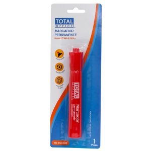 Marcador permanente de la marca Total Office, con punta tipo cincel que no se deforma y te permite escribir sobre diversas superficies, con líneas y trazos bien definidos. Su tinta base alcohol no tóxica es resistente al agua y seca de manera rápida.Especificaciones CertificacionesISO 9001, ISO 9001-2000UsoRotular, señalar, marcarColorRoj..