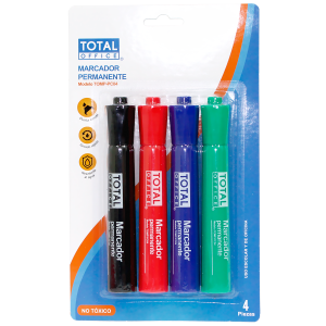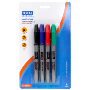 Marcador permanente de la marca Total Office, con punta tipo cincel que no se deforma y te permite escribir sobre diversas superficies, con líneas y trazos bien definidos. Su tinta base alcohol no tóxica es resistente al agua y seca de manera rápida.EspecificacionesCertificacionesISO 9001, ISO 9001-2000UsoRotular, señalar, marcarColorVariosMat..