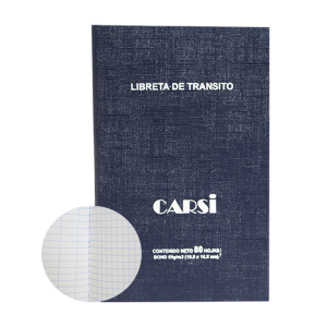Libro de Tránsito de la marca Carsi, pasta dura de cartón, lomo reforzado, para registros de orden y reportes de hechos.EspecificacionesUsoAnotar datos numéricos, registros, hechos ColorAzulMaterialPapel bondUnidad de medida/PresentaciónPiezaFormaFrancesaNúmero de hojas80 hojasInteriorCuadroCódigo de barras7503005269159..