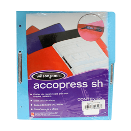 Carpeta de broche de la marca Acco, con broche metálico que sujeta las hojas con mayor seguridad, media ceja para identificación y esquinas redondeadas. Ideal para archivos.EspecificacionesUsoOrganizar, conservar, clasificarColorAzulMaterialCartulina PresboardUnidad de medida/PresentaciónPaquete c/10 pzasTamañoCartaMedida de broche8 CmCapacidad de ..