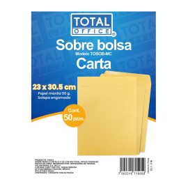 Sobre bolsa Total Office, tamaño carta (23 × 30 cm), elaborado en papel manila, con solapa engomada para cierre seguro.Diseñado para resguardar y clasificar comprobantes de forma ordenada. EspecificacionesUsoGuardar, enviar, clasificarColorManilaMaterialPapel manilaUnidad de medidaPaquete con 50 piezasTamaño/MedidaCarta (23 x 30.5 cm)Gramaje90..