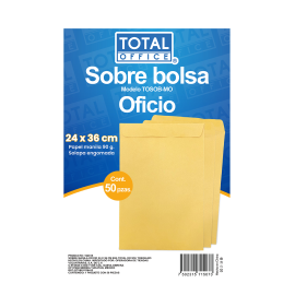 Sobre bolsa Total Office, tamaño oficio (24 × 36 cm), elaborado en papel manila, con solapa engomada para cierre seguro.Diseñado para resguardar y clasificar comprobantes de forma ordenada. EspecificacionesUsoGuardar, enviar, clasificarColorManilaMaterialPapel manilaUnidad de medidaPaquete con 50 piezasTamaño/MedidaOficio (24 x 36 cm)Gramaje90..