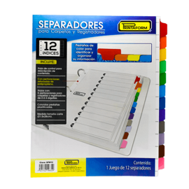 Código: 2412022 Marca: Printaform Modelo: 2412022 Tamaño: Carta Color: Multicolor Material: Cartón No. de divisiones: 10 Perforaciones: 5 Unidad de venta: Juego c/10Especificaciones Uso  ..