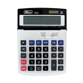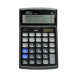 Calculadora de la marca Delta, funciones básicas, 12 dígitos, batería tipo botón de 1.5 V., números grandes en pantalla y botón de encendido/apagado.