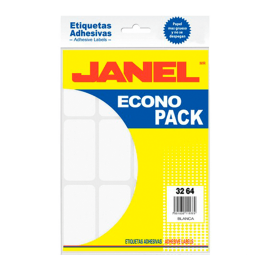 Código: 3162223 Marca: Janel Modelo: E123264200 Medida: 32 x 64 mm Forma: Rectangular Tipo de adhesivo: Permanente Color: Blanco Unidad de venta: Paquete con 504..