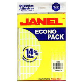 Etiqueta de la marca Janel, línea econopack en variedad de colores, para uso escolar, oficina y en el hogar. Gran adhesividad en vidrio, cartón y papel; fácil de usar.EspecificacionesUsoMarcar, identificar, clasificarColorAmarilloMaterialPapel bond de 70 gr/m2Unidad de medida/PresentaciónPaquete c/1008 piezasTamaño/Medida8 mm x 20 mmAdhesivoAc..