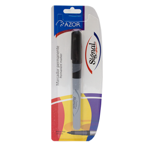 Marcador permanente de la marca Azor, con tapa indicadora del color, punta cincel para una escritura delgada y gruesa, tinta base alcohol de secado rápido y resistente al agua. Se puede marcar en vidrio, porcelana, metal, tela. Rellenable con los cartuchos 1.7 cc (repuestos).EspecificacionesUsoRotular, señalar, marcarColorNegroMaterialPlástico..