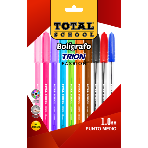 Código: 1306032 Marca: Total School Modelo: TS-TRION10F Color de tinta: Surtido Tipo de punto: Medio Color del barril: Transparente Tipo de tinta: Permanente Retráctil: No Grip: No Clip: Si Unidad de venta: Pieza c/10Especificaciones UsoEscribir, diseñar, anotar.Color de tintaSurtido Tipo ..