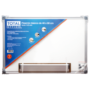 Pizarrón de la marca Total Office, superficie de melamina blanca para borrado en seco, con esquinas reforzadas y bandeja para marcadores y borrador. Incluye accesorios para montaje vertical u horizontal.EspecificacionesCertificacionesISO 9001, ISO 9001-2000UsoAnotaciones, explicaciones, dibujos brevesColorBlancoMaterialMelaminaUnidad de medida..