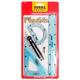 Código: 1607002 Marca: Total School Modelo: TS-G6FLEX Incluye: Regla, escuadra de 45° y 30°, transportador, compás, repuesto. Unidad de venta: PaqueteEspecificaciones Uso Actividades escolares y oficina (trazar, medir)Color Transparente/negro Unidad de medida/presentaciónPaquete Contenido 6 pzIncluye Regla, escuad..