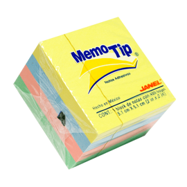 Notas adhesivas de la marca Janel, presentación en cubo de 3 x 3 con 400 hojas de papel divididas en 4 colores pastel, su adhesivo de alta tecnología permite despegarla y pegarla varias veces sin perder adhesividad. No deja residuos sobre la superficie.EspecificacionesUsoAnotar, identificar, clasificarColorPastel (4)MaterialPapelUnidad de medida/Pr..