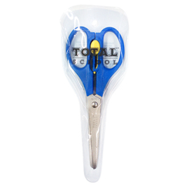 Tijera de la marca Barrilito, con mango de plástico y hoja de acero inoxidable, para corte de diversos materiales (cartón, papel cascarón, foamy, hule). Puede usarse en el hogar, y la oficina.