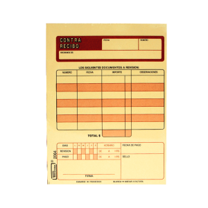 Block contra recibo de la marca Printaform, espacio para fecha y número de recibo, lista de documentos y días de revisión. Facilita el control y registro de documentos a pagarEspecificacionesUsoComprobar, controlar pagosColorCanarioMaterialPapelUnidad de medida/PresentaciónPaquete c/28 hojasTamaño1/4 cartaFormaFrancesaNúmero de copias1 copiaCódigo ..
